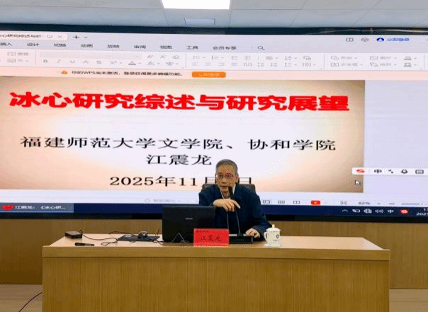 随后江震龙教授作题为《冰心研究综述与研究展望》的专题讲座。江教授为我们系统梳理了冰心研究从二十世纪二十年代至今的学术流变,冰心研究自1919年首篇评论《斯人独憔悴》起,历经1920至1930年代的奠基期,涌现出梁实秋、茅盾等重要评论;1940至1970年代持续发展;1980年代进入学术蓬勃期,大量论文与基础著作出版;1990年代因冰心研究会与文学馆的成立,研究迈向系统化与多元化。进入21世纪,研究持续深化,作品整理、传记出版、国际研讨会召开以及数字平台建设均取得显著成就,硕博论文数量可观。讲座最后,江教授展望未来,指出《冰心全集》尚有佚文有待发掘,版本校汇工作也需完善;大型综合性研究资料有待整理出版;冰心研究专著仍有广阔开拓空间等问题,提出个人认为的冰心研究相对薄弱的环节,为在座师生拓展研究思路提供了具体的建议。