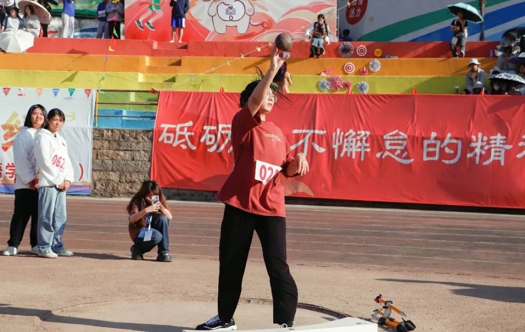 站定、置球、蓄力,蹬腿、送髋、转体,挺胸、低头、推臂、拨球!连贯动作一气呵成,用尽全力投掷到最远处,承载着自己的青春与梦想!