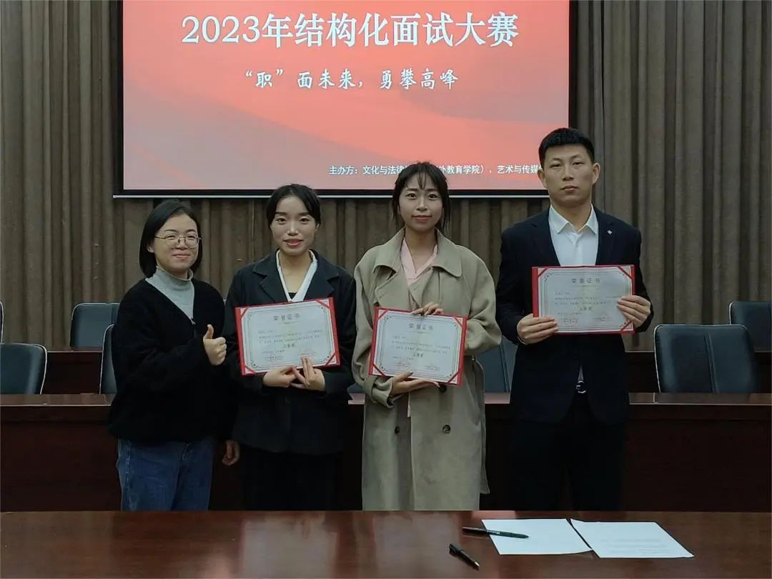 齐喜三老师、花蕾老师、杜丽婷老师、林璐璐老师依次为获奖同学颁奖。全体评委老师、参赛选手及工作人员共同合影留念,本次结构化面试大赛圆满结束。