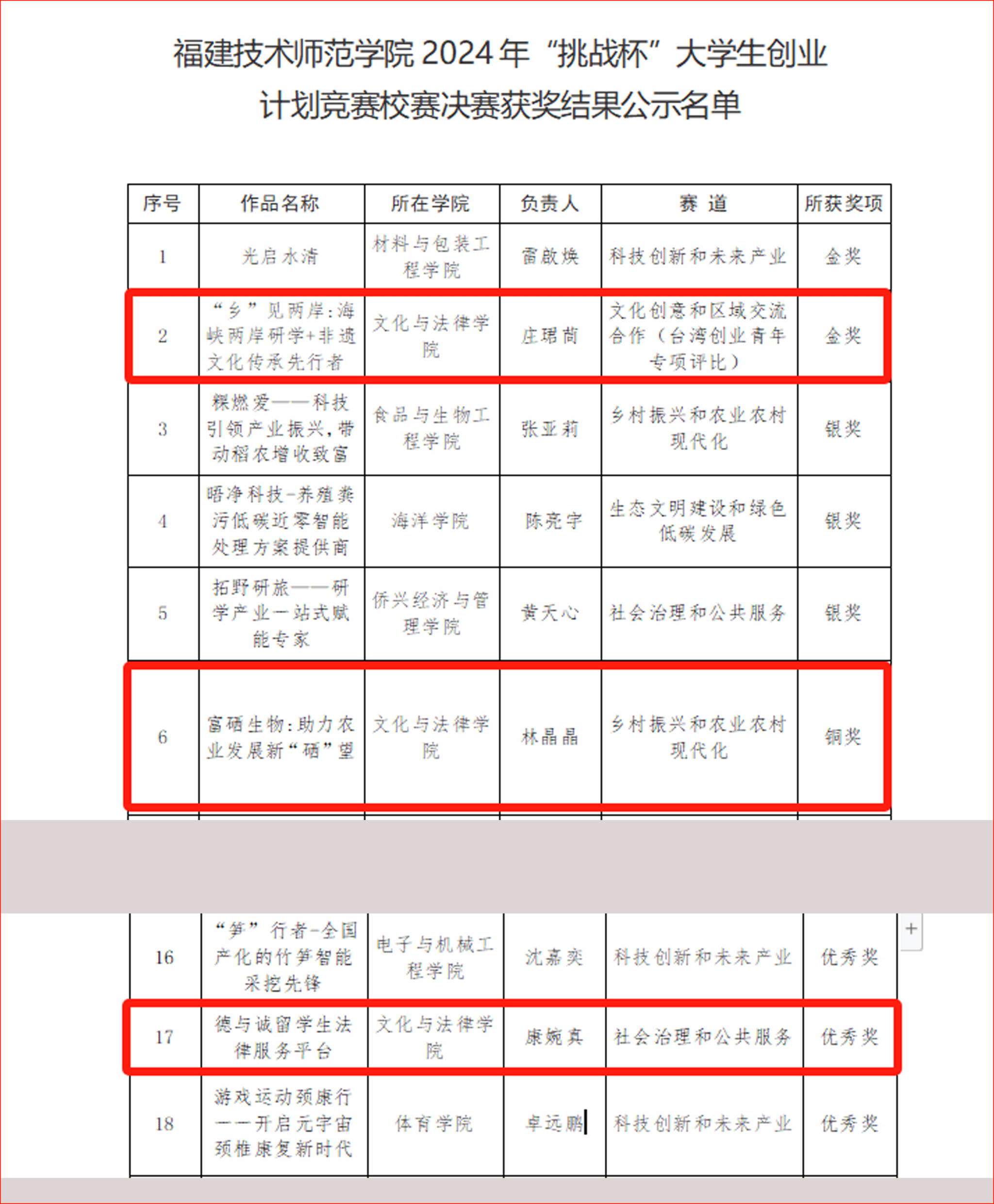 近日,据福建技术师范学院校团委发布的官方消息,按照《关于举办校2024年“挑战杯”大学生创业计划竞赛的通知》文件要求,经自主申报、网络评审和现场公开答辩等环节,共评选出2024年“挑战杯”大学生创业计划竞赛校赛拟获奖作品21件。其中,金奖2件、银奖3件、铜奖5件、优秀奖11件。