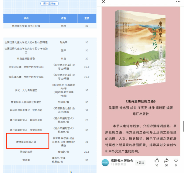 近日,在福建省教育部门与新华发行集团联合发布的2025年暑假中小学生阅读推荐书目,以及福建省出版协会发布的“闽版好书”6月推荐书单中,我院吴章燕、钟志强、成业、庄亮亮、林佳、潘晓丽等教师编著的《唐诗里的丝绸之路》成功入选。该书由鹭江出版社出版,以唐诗为脉络,生动展现丝绸之路跨越千年的文化长卷,为青少年暑期阅读提供了兼具文学性与知识性的优质读本。