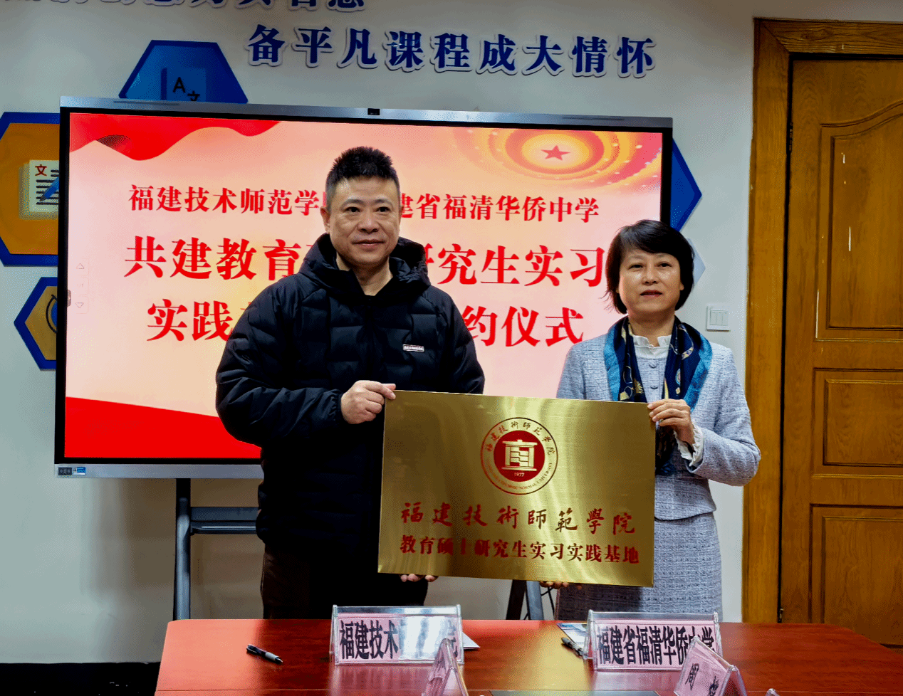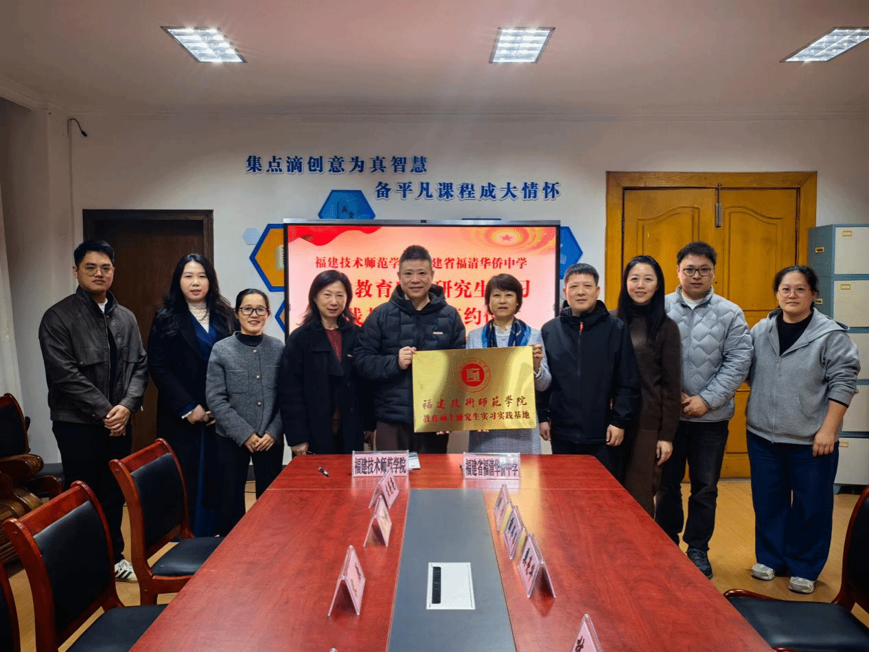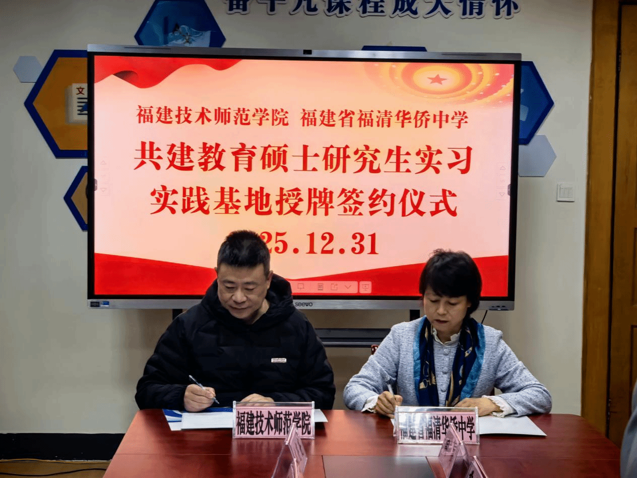 12月31日下午,学院与福清华侨中学共同举行教育硕士实习基地签约暨授牌仪式。福清华侨中学党委书记莫亮华、副校长林心松、薛韦韦、教务处主任周烨、副主任何昀,以及我院院长宋原、副院长谢西娇、汉语言文学专业主任吴章燕、副主任庄亮亮、教师代表翁丽嘉出席了仪式。