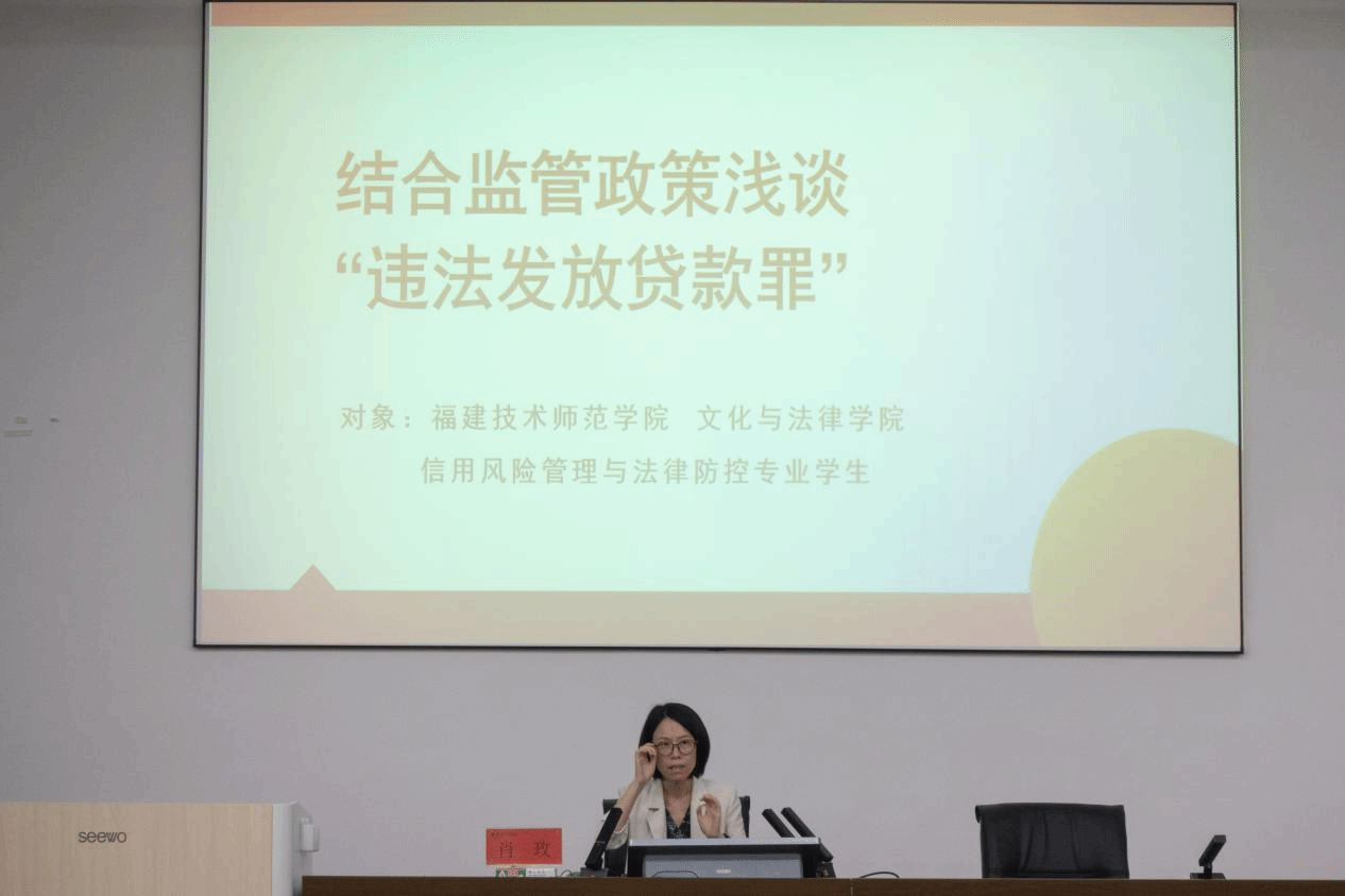 为提升大学生对金融犯罪特别是违法发放贷款罪的认识,增强法律风险防范意识和能力,我院于10月18日晚在弘毅苑报告厅举行主题为《结合监管政策浅谈“违法发放贷款罪”》的学术讲座。本次讲座由平安银行福州分行风险管理部总经理肖玫主讲,学院副院长张剑平主持讲座,法控专业师生参加了本场讲座。