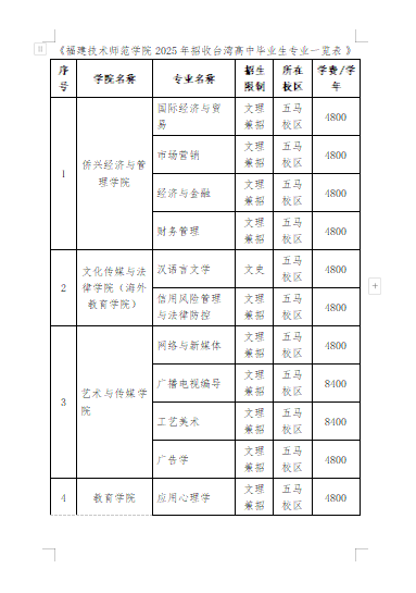 根据教育部关于普通高等学校依据台湾地区大学入学考试学科能力测验成绩招收台湾高中毕业生的有关规定,2025年福建技术师范学院拟招收台湾学生,具体安排如下: