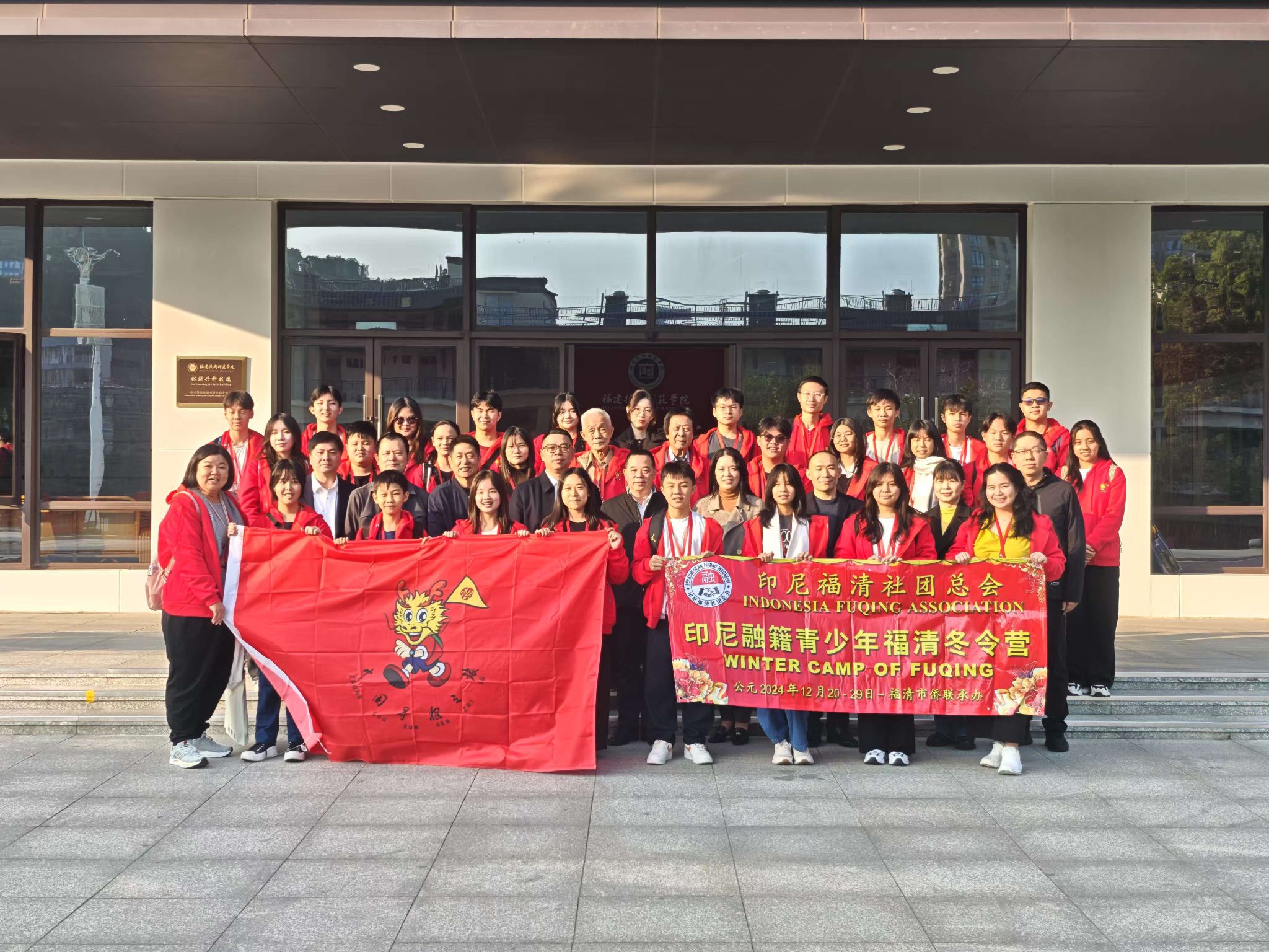 2024年12月21日下午,海外华裔青少年“中国寻根之旅”冬令营福建福清团在福建技术师范学院举行开营仪式,来自印度尼西亚的30名营员及领队参加。福建省侨联文化交流部部长林遵,福州市侨联副主席陈秋华,文化联络部部长林友平,福清市副市长林万焰,福建技术师范学院党委统战部部长郭永云,福建技术师范学院文化与法律学院(海外教育学院)主持党委工作的副书记王昌伟、副院长肖晶,福清市侨联主席郑光辉,印尼福清社团总会副总主席林文珠、副主席陈清章及全体冬令营营员出席开营仪式。林遵为冬令营授旗。郑光辉主持开营仪式。