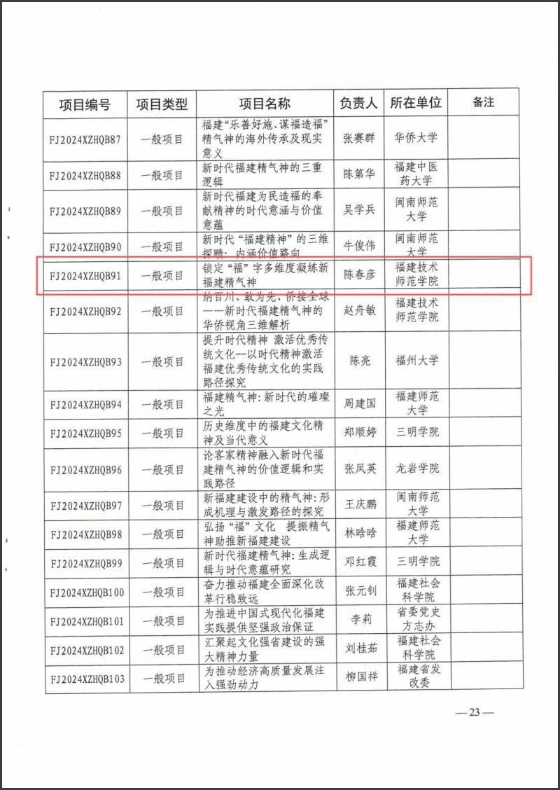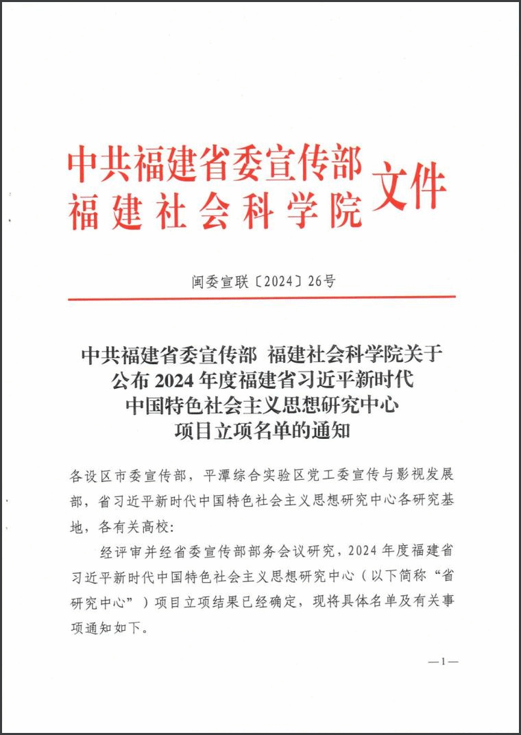 近日,中共福建省委宣传部、福建省社科院公布了《2024年度福建省习近平新时代中国特色社会主义思想研究中心项目立项名单》(闽委宣联〔2024〕26号),共110个课题获批年度项目。我院院长陈春彦教授主持的课题《锁定“福”字多维度凝练新福建精气神》(项目号:FJ2024XZHQB91)获批为一般项目立项,纳入省社科基金项目。