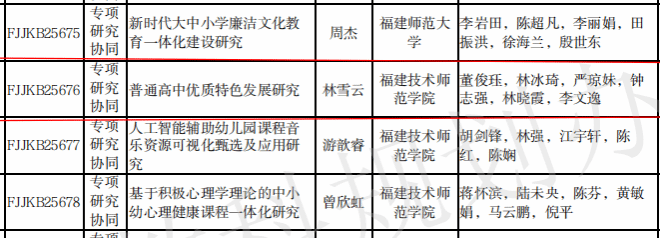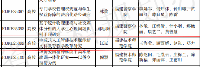 11月19日,福建省教育厅公布了2025年教育规划课题立项名单。我院宋原教授主持的《教育强国背景下福建省职业教育教师教学创新团队建设研究》,汪岚副教授主持的《生成式人工智能技术赋能新文科教育教学改革研究》,林雪云老师主持的《普通高中优质特色发展研究》三个项目获批。详情如下: