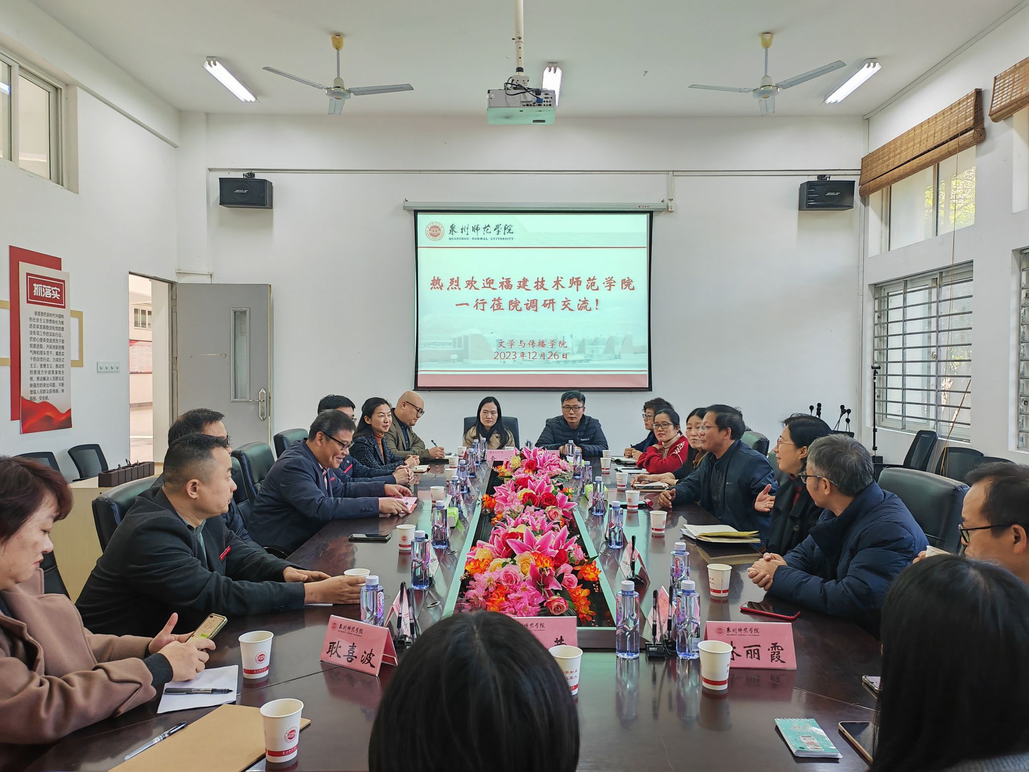 为推进学院汉语言文学(师范)专业二级认证工作,提升本科办学水平,12月26日下午,我院谢西娇副院长率队前往泉州师范学院文学与传播学院调研交流,受到了泉州师范学院文学与传播学院院长王勇卫、党委副书记林瑞民、对外汉语系党支部书记邱晓明、系主任王曦、汉语言文学(师范)系副主任李莉的热情接待。我院汉语言文学(师范)专业主任吴章燕、副主任林海参加本次交流。