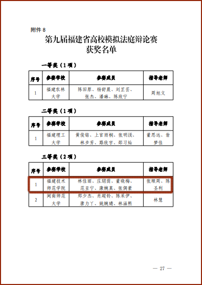 我院学子林佳丽、庄珺茼、董晓梅、范亚宁、康婉真、张倜豪组成的参赛团队,在第九届福建省高校模拟法庭辩论赛斩获三等奖,成功入选本次学科专业竞赛获奖名单。模拟法庭辩论赛指导老师为张顺周、陈圣利。
