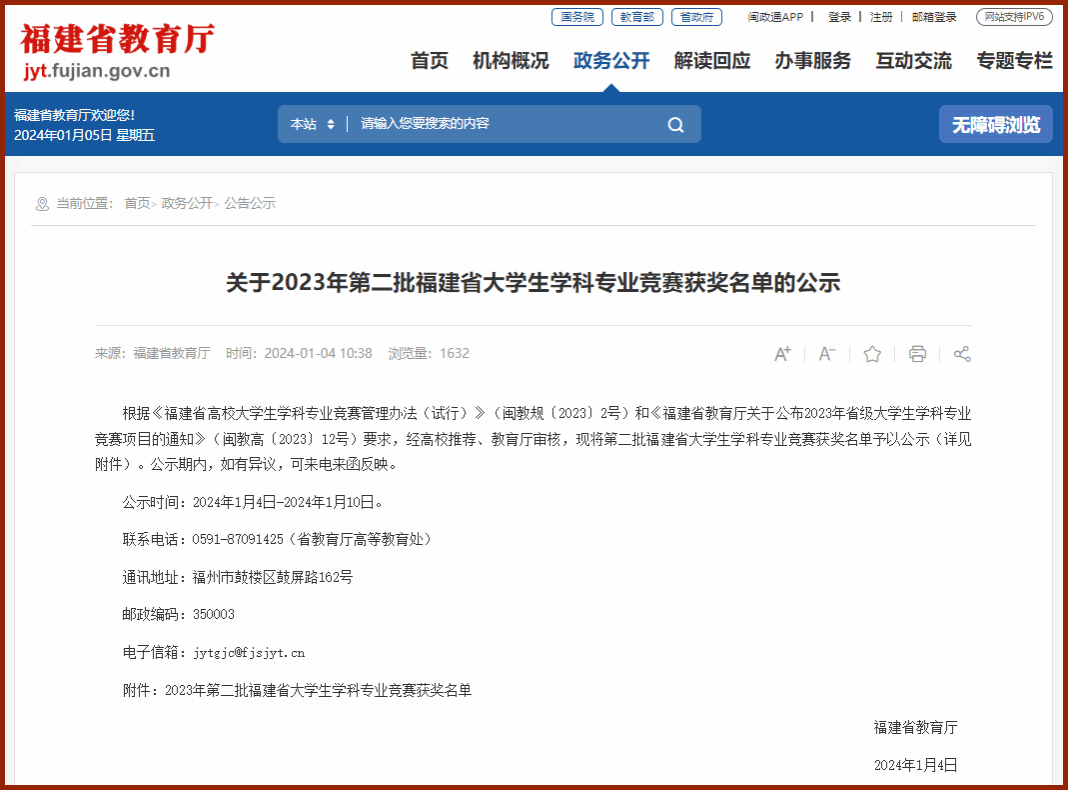 根据《福建省高校大学生学科专业竞赛管理办法(试行)》(闽教规〔2023〕2号)和《福建省教育厅关于公布2023年省级大学生学科专业竞赛项目的通知》(闽教高〔2023〕12号)要求,经高校推荐、教育厅审核,2023年第二批福建省大学生学科专业竞赛获奖名单于2024年1月4日在福建省教育厅官方网站公示。公示链接为http://jyt.fujian.gov.cn/xxgk/gggs/202401/t20240104_6372225.htm