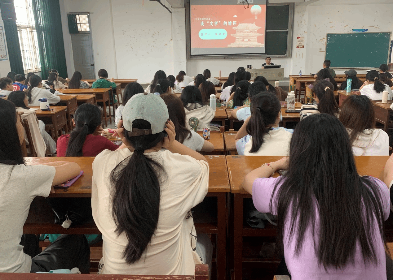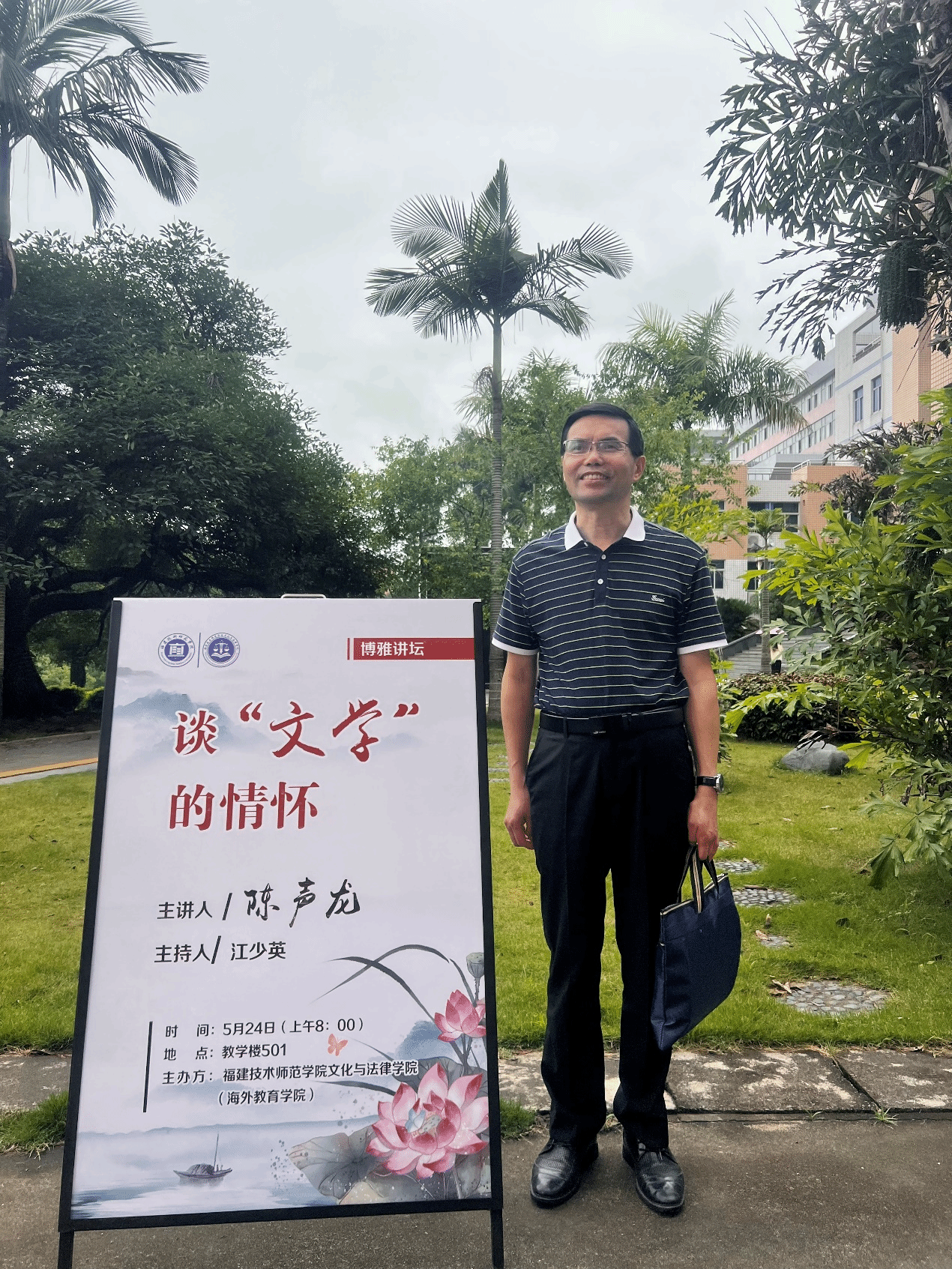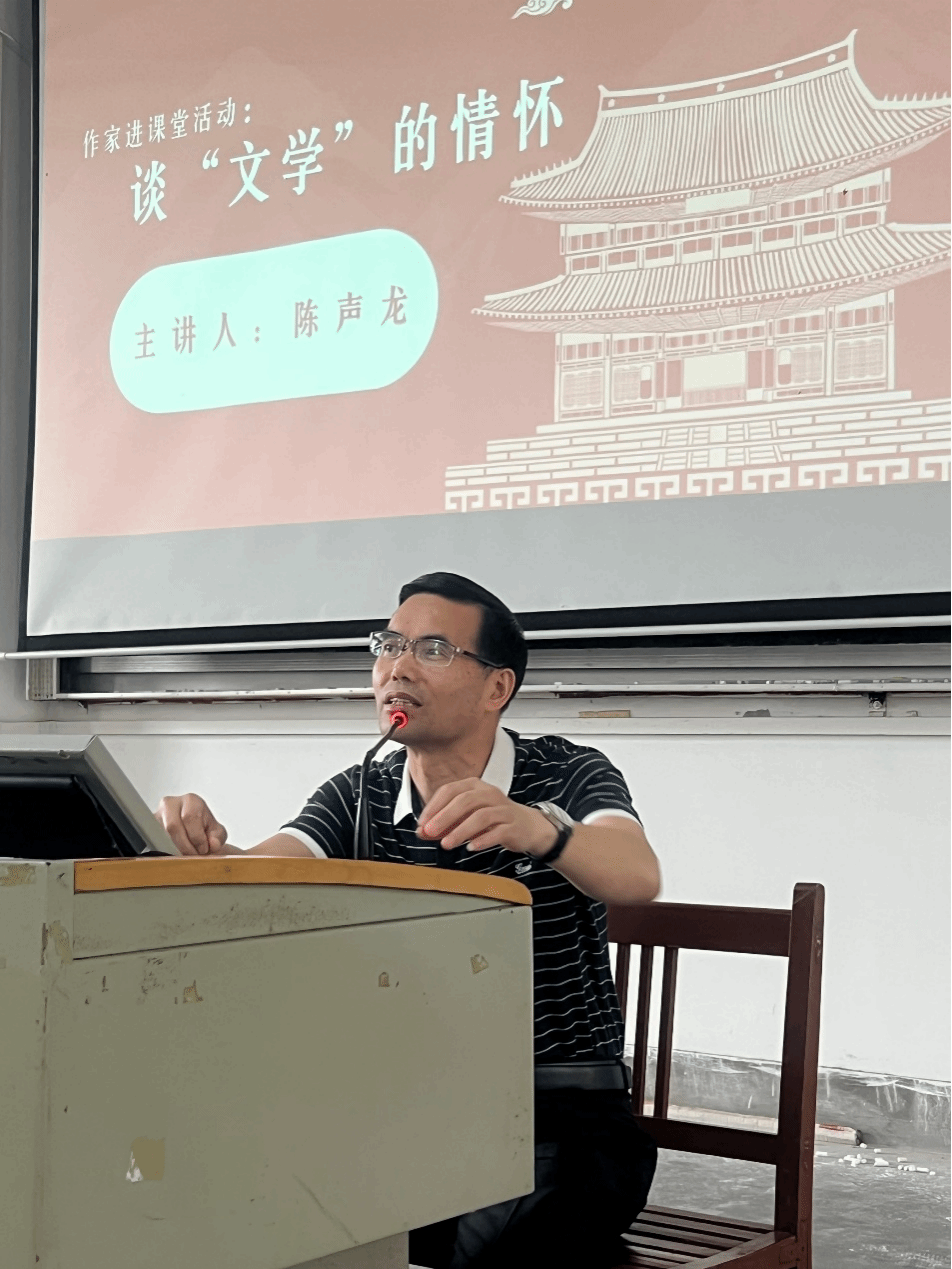 5月24日上午,文化与法律学院(海外教育学院)诚挚邀请福建省作家协会会员,福清市作家协会名誉主席陈声龙先生,于教学楼501举行作家进课堂活动,陈声龙系我校83级中文教育专业的校友,他作为主讲嘉宾,开设了“谈‘文学’的情怀”的讲座。到场的嘉宾还有福清市作协常务副主席何刚、福清市政协融光诗社常务副秘书长叶孔亮,我院2022级汉语言文学专业的学生到场聆听,活动由江少英老师主持。