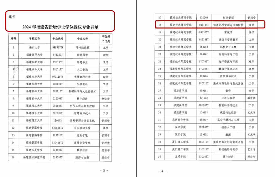 近日,福建省学位委员会发布《福建省学位委员会关于公布2024年新增学士学位授权专业名单的通知》(闽学位〔2024〕4号),公布了今年福建省27所院校的74个新增学士学位授权专业,我院信用风险管理与法律防控专业(专业代码030104T,以下简称:法控专业) 喜获法学学士学位授予权。