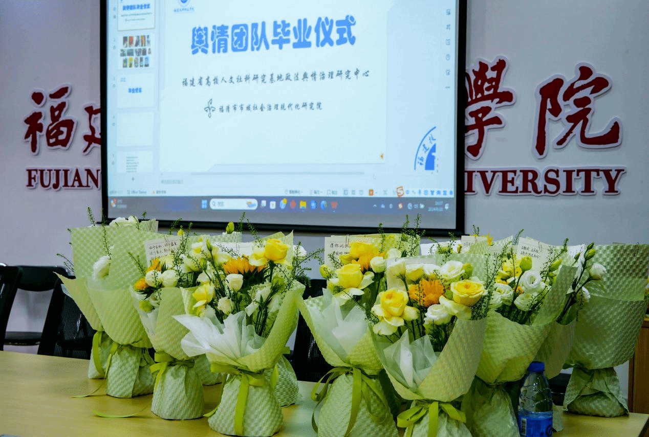 随后,老师们和学弟学妹们共同为毕业生们送上了鲜花和祝福。这一刻,不仅是对毕业生们过去努力的肯定,更是对他们未来人生的美好祝愿。此次欢送会不仅为毕业生们留下了深刻而美好的回忆,也进一步增强了舆情治理研究中心师生之间的凝聚力。祝愿研究团队的毕业生们能以更加坚定的信念和更加饱满的热情,投身到各自的工作岗位中,为社会的发展贡献自己的力量。在热烈的掌声中,本次毕业欢送会圆满落幕。