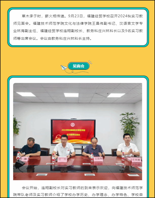 (3)福建经贸学校:《迎实习教师,启教育新程——福建经贸学校召开2024秋实习教师见面会》(点击查阅)