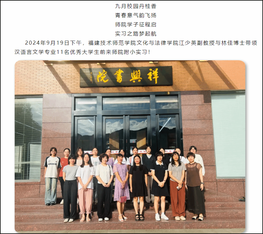 近期,我院2021级汉语言文学专业(师范)教育实习工作全面展开,139名实习生在学院统一组织安排下,分别赴福建经贸学校、师院附属中学、师院附属小学、福清二中、福清第二实验小学等实习实践基地,开展为期10周的教育实习。