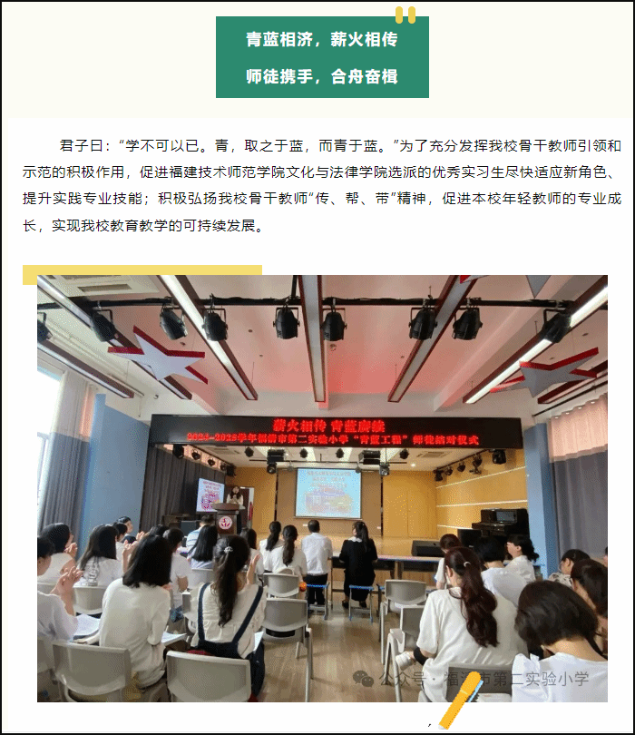 (2)福清第二实验小学:《薪火相传 青蓝赓续——福清市第二实验小学“青蓝工程”师徒结对仪式暨福建技术师范学院文法学院实习导师聘任仪式》(点击查阅)