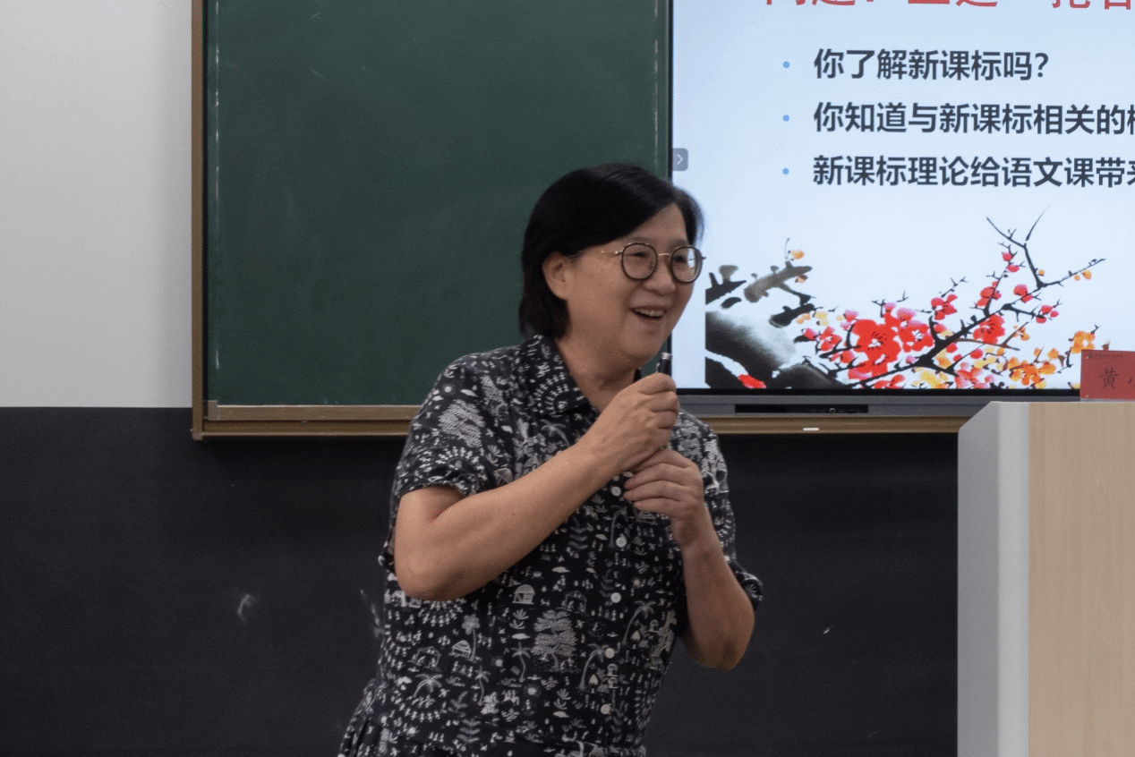 讲座伊始,黄教授以大单元教学、群文阅读的概念为切入点,以著名诗人李清照的诗词为例,分析古诗文的解读方法。在学生作品展示中,学生们通过点评、写诗词或剧本等不同方式研究李清照诗中的各类意象,进一步表明了新课标的具体教学要求。