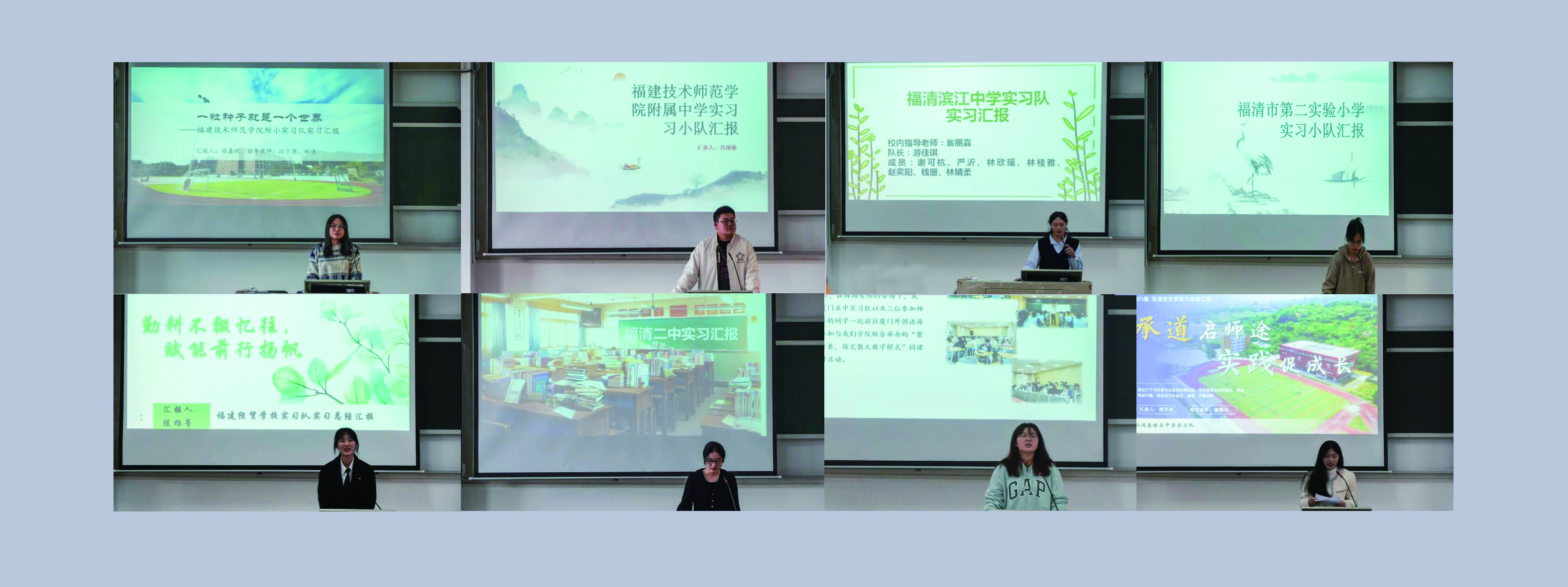 十个实习小队分别从多元化的视角生动地分享了他们的实习经历。随后,主持人公布“优秀实习生”表彰名单并举行颁奖仪式,获奖学生与指导老师合影留念。