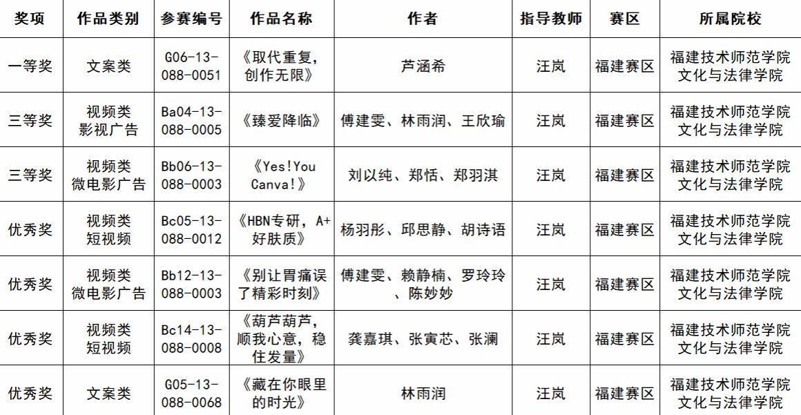 近日,由我院汪岚老师指导的汉语言文学专业学生,历经三个月的不懈努力,最终在2025年“中国大学生好创意”第17届全国大学生广告艺术大赛(简称“大广赛”)中,斩获福建赛区一等奖1项、三等奖2项、优秀奖4项,一举创下我院在该赛事中的历史最佳纪录。
