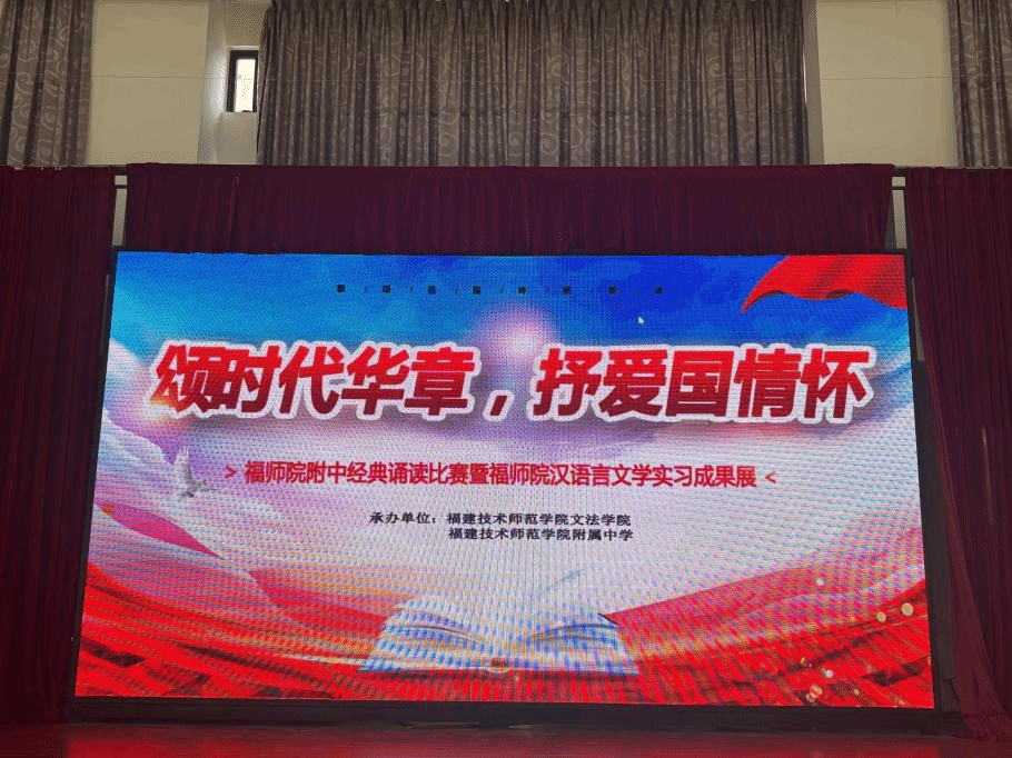 为深化校地协同育人,全面展示教育实习成果,2025年10月22日,由我院与福师院附中联合主办的“颂时代华章,抒爱国情怀”经典诵读比赛在附中体育馆举行。附中陈兢校长、陈斌副校长、各年级语文教师、我院汉语言文学专业教师吴章燕、丁豫龙、谢陶生参加本次活动。