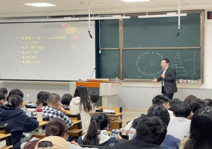 讲座中,蔡晓荣教授以“为何要了解传统法律文化”为引,指出探寻法律中蕴含的“人文精神”,不仅为满足历史好奇,更是为了深刻理解与反思当代法律理念与实践,从而获得独特的文化视角。在核心内容阐述环节,蔡教授深入解析“情、理、法”三者的融合互动,揭示传统司法追求“天理、国法、人情”相统一的动态平衡价值取向,剖析了以宗法制度为基础的“家国同构”模式,阐述其对传统法律秩序与人伦规范的深刻影响,重点辨析“礼”与“刑”的关系及“出礼入刑”等原则的历史内涵,通过司法实践中的典型案例,生动展现了传统司法如何将人伦情理融入裁判,追求法律与社会效果的统一。整场讲座逻辑严密、内容全面,讲解清晰,语言幽默,互动环节活跃。在与师生的交流中,他对传统法律与现代法律的衔接等相关问题,给予了具体且有深度的解答。