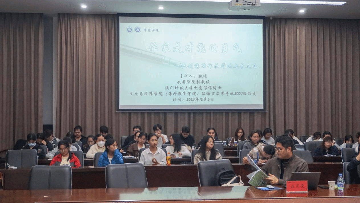 12月3日下午,我院特邀2004级校友、武夷学院副教授魏维于华贞图书馆报告厅举办“作家是才能的勇气”主题讲座。讲座由汉语言文学专业副主任成业老师主持,副院长谢西娇、汉语言文学专业副主任庄亮亮、专任教师林荣钦以及学生代表参加。