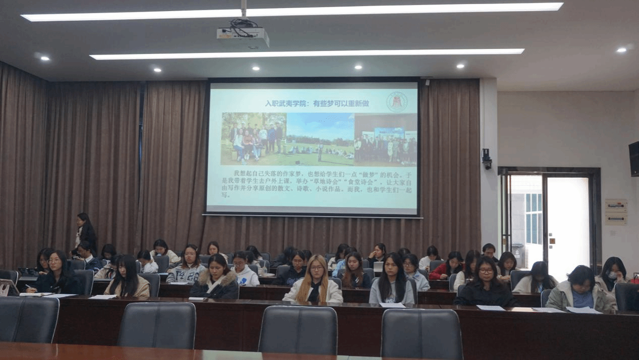 讲座中,魏副教授介绍自己“作家梦”的缘起,以及自己求学深造路上的成长经历,特别是她在成长迷茫时刻通过写作和积极生活的态度完成了自我疗愈,借此鼓励学生要勇敢面对生活中的挫折。她介绍自己在教学实践方面的探索和在学术创作方面的成果;她表示从事创意写作是一条有别于纯粹创作与纯粹研究的“第三条路”,创意写作从业者应当用写作赋能乡村建设,服务地方经济社会发展。