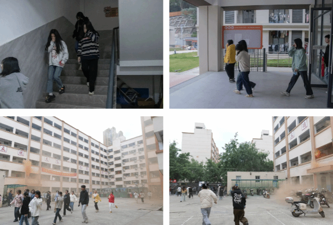工作人员根据原定方案提前到指定位置站位,以确保演练活动顺利举行。当警铃声响起,楼道出现滚滚浓烟,宿舍内的学生情绪冷静,井然有序地撤离至楼下空地,全程秩序良好。