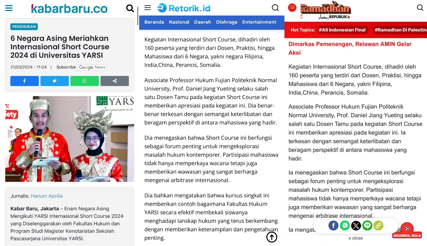 在项目开班仪式上,雅尔西大学校长法斯里教授发表了热情洋溢的讲话,并特别向集中参训的我院同学挥手致意表示欢迎。我院信用风险管理与法律防控专业教师、中印尼经贸法律研究中心执行主任江悦庭博士应邀担任该培训项目第二天的授课专家,授课主题为How to Draft an Effective Arbitration Clause.包括Republika、Retorik、Kabarbaru等多家印尼当地媒体详细报道了此次国际培训项目情况,并在报道中引述了我院江悦庭博士对该项目的高度评价。
