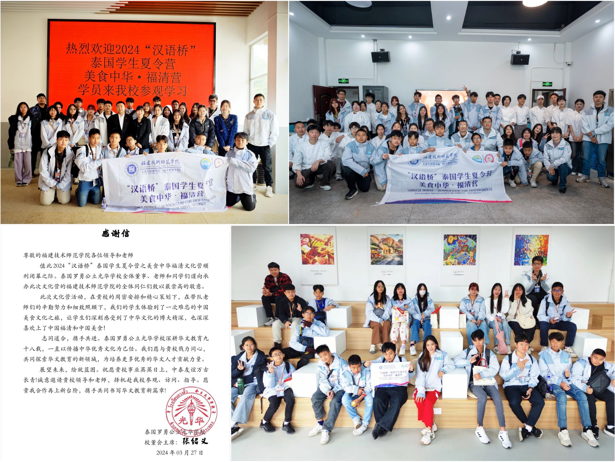 “我们泰国团抵达泰国了”…… “现在抵达罗勇府光华学校了”…… 3月27日晚,泰国邓老师带着一群刚从中国结束夏令营的青少年学生抵达泰国,一路实时更新共享行程。当晚,泰国罗勇公立光华校董会主席发出了一封感谢信,说他们的学生“体验到了一次难忘的中国美食文化之旅……,也深深喜欢上了中国福清和中国美食!” 至此,由福建技术师范学院承办的“2024‘汉语桥’泰国学生夏令营之美食中华”福清文化营圆满结束。