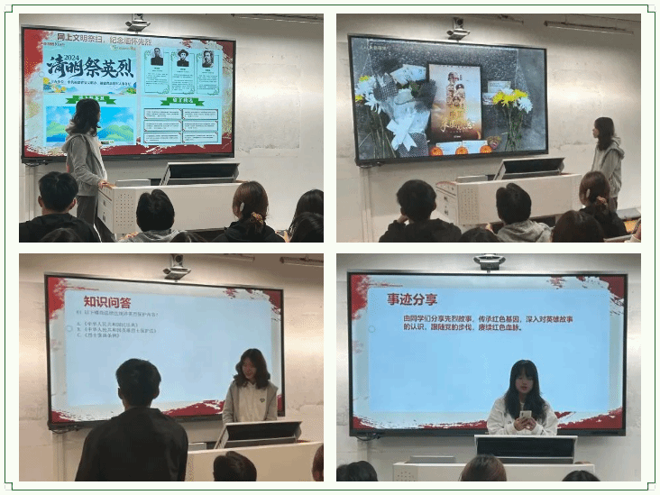 2023级信用风险管理与法律防控2班分别从清明节的由来、鉴赏清明节相关诗词、缅怀革命先烈以及介绍热河革命烈士纪念馆等方面开展清明节主题宣传教育,激励各位青年和团员增强历史责任感和使命感,砥砺前行。