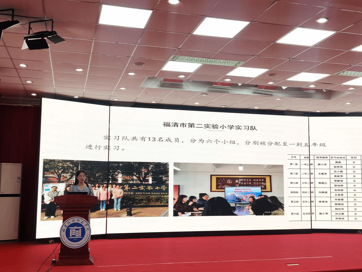 随后,8个实习队分别派出代表汇报各自的实习工作情况,向师生们展示实习队员们的风采,分享了实习体会和感悟。他们分别是福州屏东中学实习队(汇报人卢湘妍,带队老师吴章燕)、福建技术师范学院附属中学实习队(汇报人黄瑞颖,带队老师林雪云、雷莹)、福清一中(观溪校区)实习队(汇报人施祺杭,带队老师席晓青)、福建技术师范学院附属小学实习队(汇报人许本汶,带队老师江少英)、福清第二实验小学实习队(汇报人杨玲芳,带队老师林荣钦)、福清瑞亭小学实习队(汇报人蓝芳婷,带队老师曾喆莹)、福建经贸学校实习队(汇报人陈小璐,带队老师林海)、莆田华侨中学实习队(汇报人王怡婷,带队老师谢陶生)。精彩的报告,讲述着他们10周实习过程中的紧张与充实、兴奋与不舍、成长和进步,与会师生不时报以热烈的掌声,向他们表示祝贺。