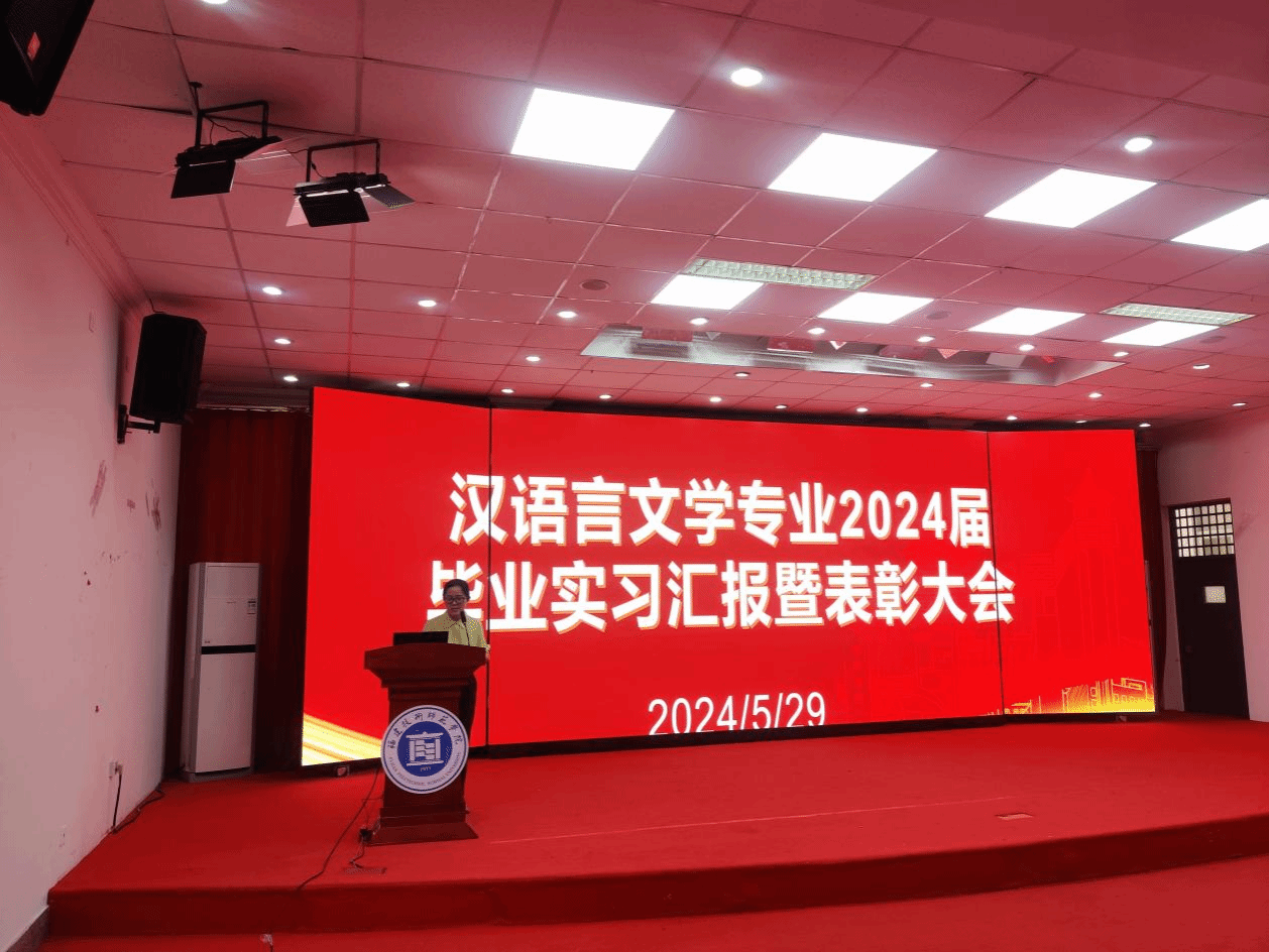 5月29日上午,我院在科学楼金泰报告厅举办汉语言文学专业2024届毕业实习汇报暨表彰大会。院领导陈春彦、谢西娇、团委书记钟恩伟以及汉语言文学专业全体教师、2024届实习生、2021级学生参加了大会。本次活动由汉语言文学专业主任吴章燕主持。