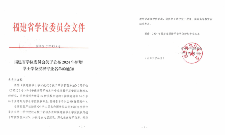 近日,福建省学位委员会发布《福建省学位委员会关于公布2024年新增学士学位授权专业名单的通知》(闽学位〔2024〕4号),公布了今年福建省27所院校的74个新增学士学位授权专业,我院信用风险管理与法律防控专业(专业代码030104T,以下简称:法控专业) 喜获法学学士学位授予权。
