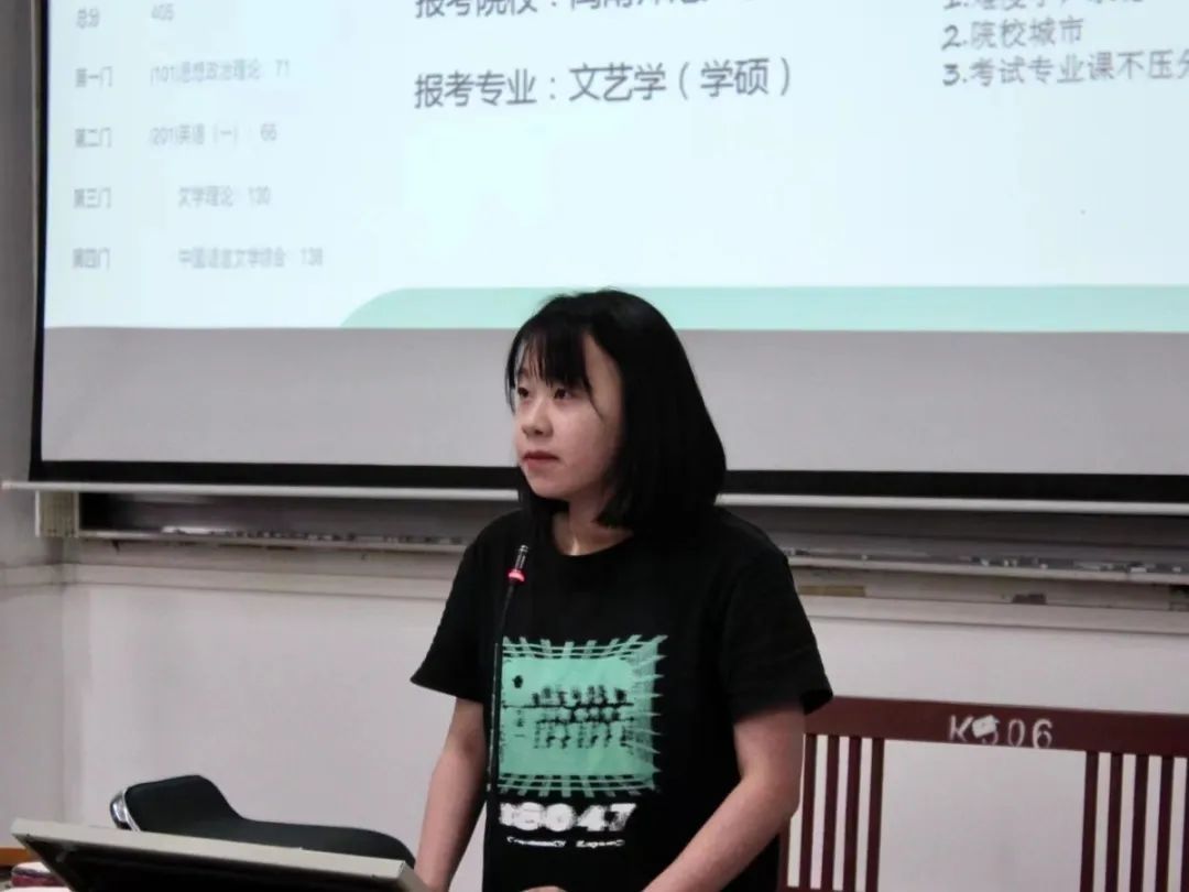 谢苏雨同学围绕“如何学好专业课”这一主题,分享了学习经验。她指出在面对考研院校的选择时,应当考虑专业、地区等多种因素,进行全面检索以精准定位所选院校。随后讲解了中国古代文学、外国文学、文学理论等专业课的学习思路,强调要注重专业课的学习,来为考研打下良好基础。