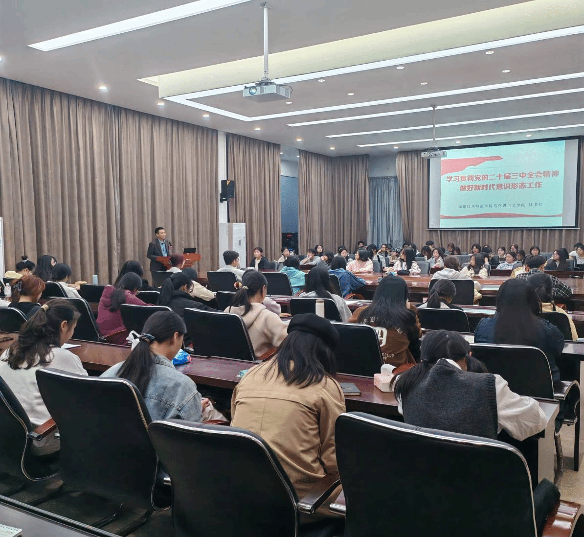 意识形态工作是党的一项极其重要的工作。习近平总书记指出,要牢牢掌握意识形态工作领导权,建设具有强大凝聚力和引领力的社会主义意识形态。林教授围绕意识形态工作主要任务与目标、应遵循的重要原则等方面,结合真实案例,使抽象的理论知识变得鲜活易懂,极大地提搞了讲课的效果。他强调新时代意识形态重要性,要用习近平新时代中国特色社会主义思想凝心聚魂,以社会主义核心价值观为引领,推动文化建设与意识形态工作协同发展,不断提升国家文化软实力和中华文化影响力。同时,林教授指出了新时代意识形态工作面临的诸多挑战,特别是在如今网络媒体高度发达的现状下,信息网络化更是一把双刃剑。作为入党积极分子,严格要求自己,坚定正确的意识形态立场,意识形态绝对不能走错路、跑偏道。要深入学习贯彻党的二十届三中全会精神,提高思想政治素质,做党的政策主张的传播者、社会进步的推动者。