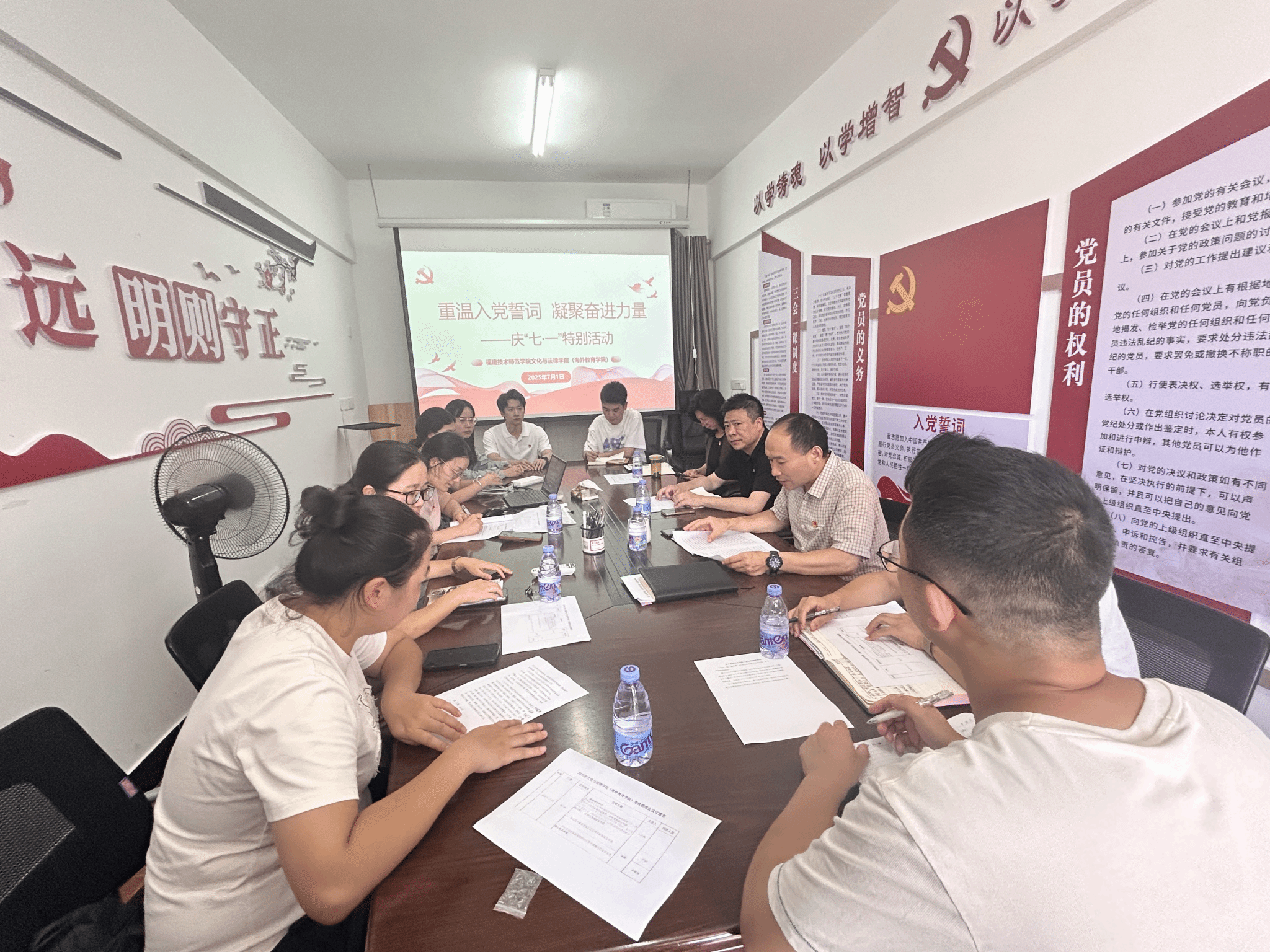 为庆祝中国共产党成立104周年,激励广大党员担当有为,7月1日下午,我院开展“重温入党誓词 凝聚奋进力量--庆‘七一’”特别活动,院党政领导班子、专业主任、全体辅导员和办公室党员参加活动。