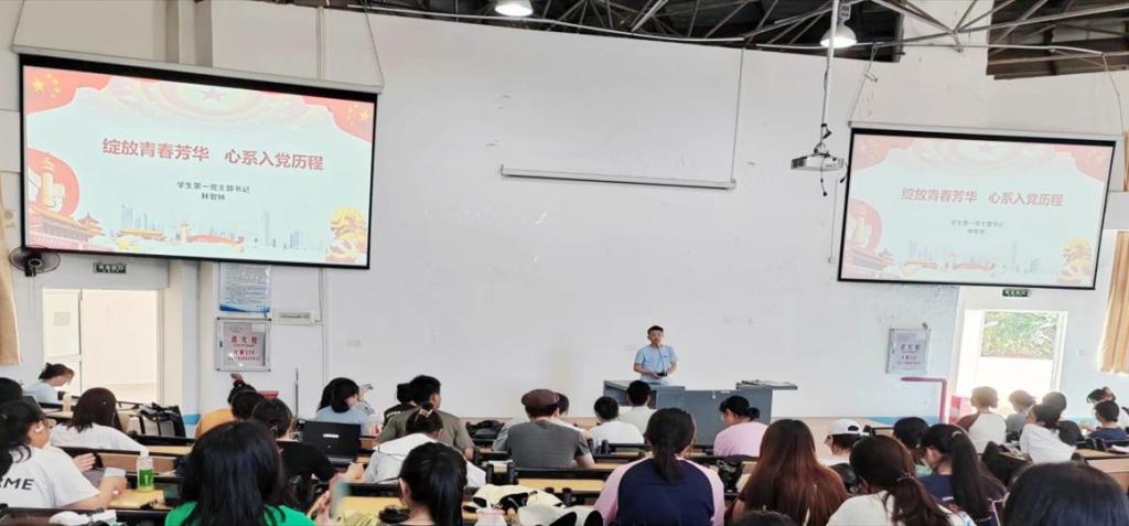 林智林老师结合自身入党的心路历程、新时代青年优秀事例,介绍了“入党历程”与“青年应有之面貌”等内容。他详细地讲解了入党的主要流程:入党积极分子的确立和培训教育、发展对象的确定和考察、预备党员的接收及预备党员的教育、考察和转正四个方面。随后,通过“中国共产党国际形象网宣片《CPC》”、“青春,是什么模样?”、“这就是中国青年”等视频素材,以生动有趣的方式宣传了青年应是有理想、有担当、不畏艰险、积极进取的模样。最后,他希望青年学生能保持清醒的自我认知,端正心态,努力拼搏,向榜样看齐,向模范学习,有一份热发一份光,在全面建设社会主义现代化国家新征程中绽放青春芳华!