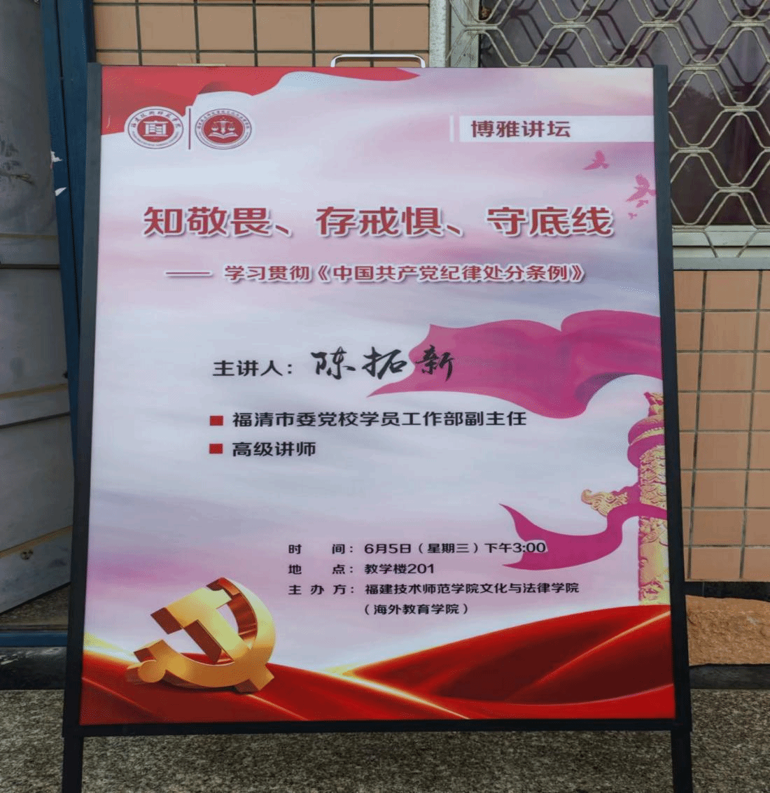 为引导党员干部深刻理解、准确把握新修订的《中国共产党纪律处分条例》(以下简称《条例》),推动党纪学习教育走深走实,2024年6月5日下午,文化与法律学院针对《条例》召开专题辅导报告,特邀福清市委党校学员工作部副主任、高级讲师陈拓新作报告。